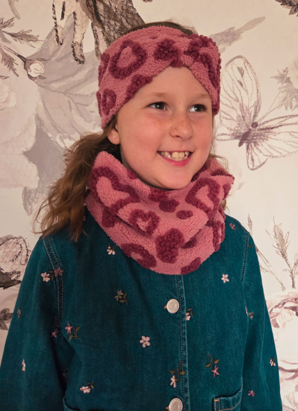 Deze set bestaat uit een bijpassende colsjaal & haarband in teddy stof, in een gewenste maat & kleur teddy stof met hartjes print. Heerlijk warm voor de koudere dagen!
