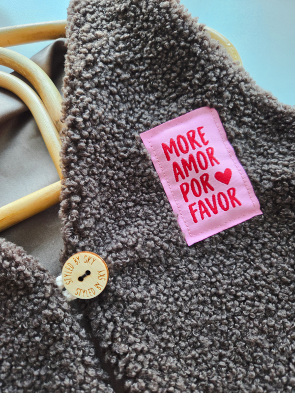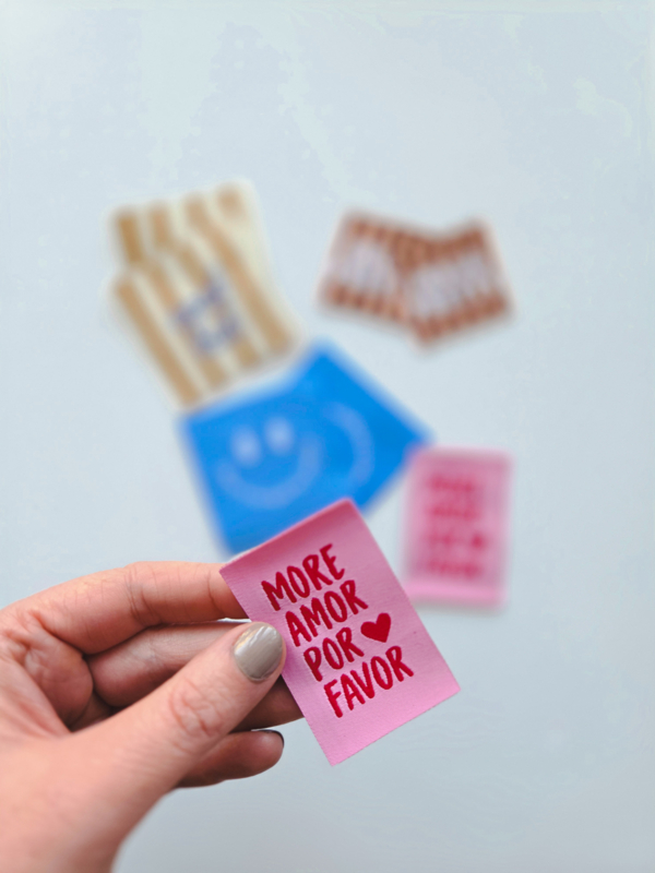 - Statement label in een roze kleur met de tekst 'More amor, por favor'