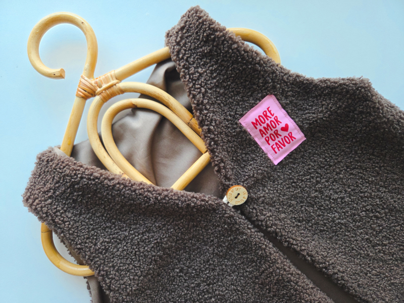 Een korte, krullende teddystof in een donker bruine kleur. 🤎 Met een effen, bruine kleur 100% katoenen voering. Afgewerkt met de mooiste details: