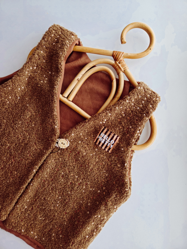 Een korte, krullende teddystof in een caramel bruine kleur met pailletten door de stof gestikt. 🤎 Met een effen caramel kleur 100% katoenen voering. Afgewerkt met de mooiste details: