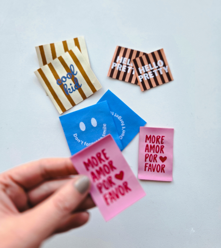 - Statement label met zacht roze en bruine verticale strepen met de tekst 'Hello pretty´!