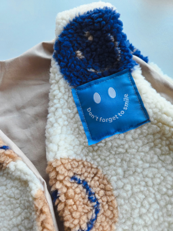 - Afgewerkt met statement label op de borst. Blauw met smiley :)