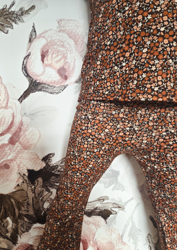 Kleine bruine bloemen print, in de trend kleur van deze winter: bruin! Het broekje heeft een zwarte achtergrond kleur en is voorzien van een bloemenprint met de kleuren ecru, beige en bruin. Een hele warme, mooie kleur en lieve print. Het broekje is gemaakt van een rekbare en zachte tricot stof.