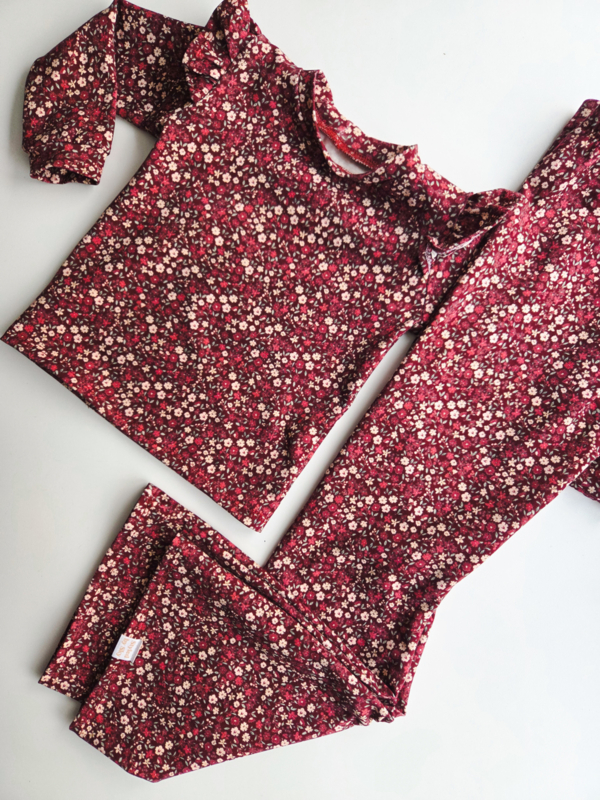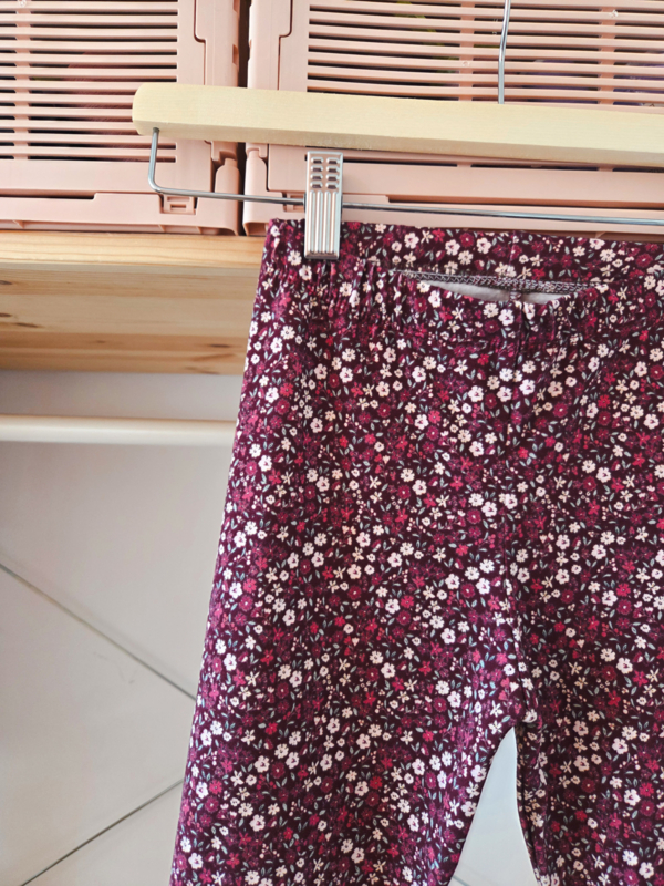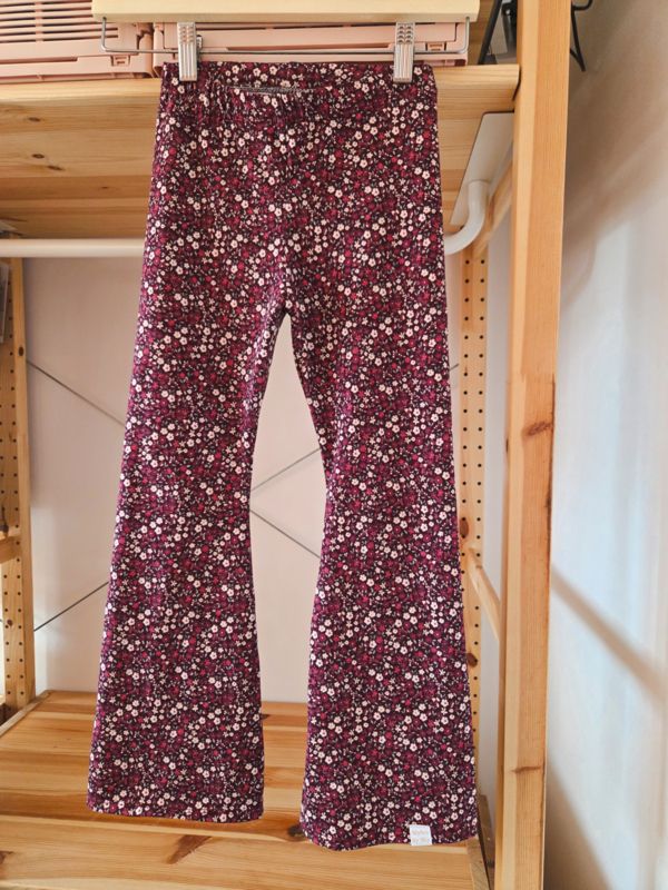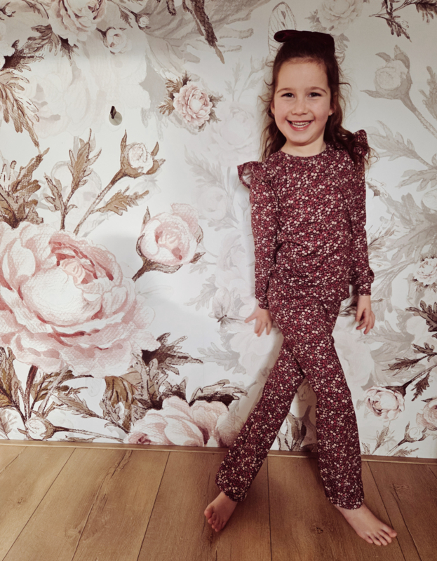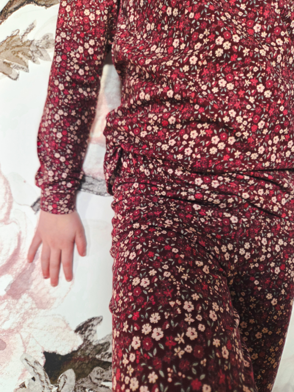 Kleine burgundy/donker rode bloemen print, in de trend kleur van deze winter: burgundy! Het broekje heeft een donker rode achtergrond kleur en is voorzien van een bloemenprint met de kleuren ecru en lichte- en donkere rode kleuren. Een hele warme, mooie kleur en lieve print. Het broekje is gemaakt van een rekbare en zachte tricot stof.